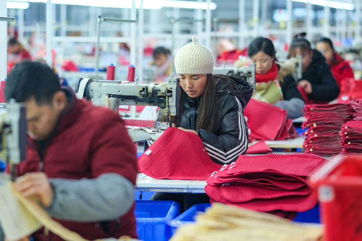 2024年1月18日,社區(qū)居民在紅安社區(qū)的鄉(xiāng)村振興就業(yè)車間工作。紅安社區(qū)是由易地搬遷安置區(qū)單獨(dú)成立的新社區(qū),