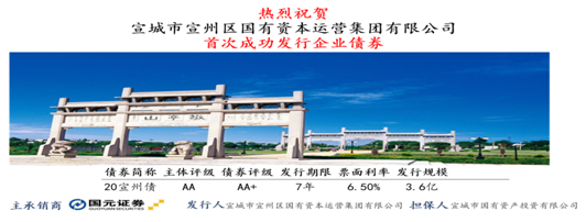 12月2日 ,我公司“2020年宣城市宣州區(qū)國有資本運營集團(tuán)有限公司企業(yè)債券”成功發(fā)行。本次債券由國元證券有限公司主承銷,發(fā)行規(guī)模3.6億元,發(fā)行期限7年,主體評級AA,債項評級AA+,票面利率6.5%。本期債券為我集團(tuán)公司首次公開發(fā)行企業(yè)債券,也是宣州區(qū)內(nèi)企業(yè)首次公開發(fā)行企業(yè)債券。